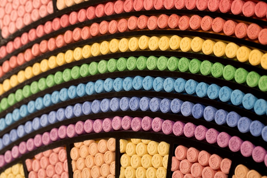 Chemical X developed this series of work in recognition of a cultural zeitgeist in British history – the introduction and influence of the recreational drug 3,4-methylenedioxymethamphetamine (MDMA), the original active ingredient in the pill named Ecstasy.