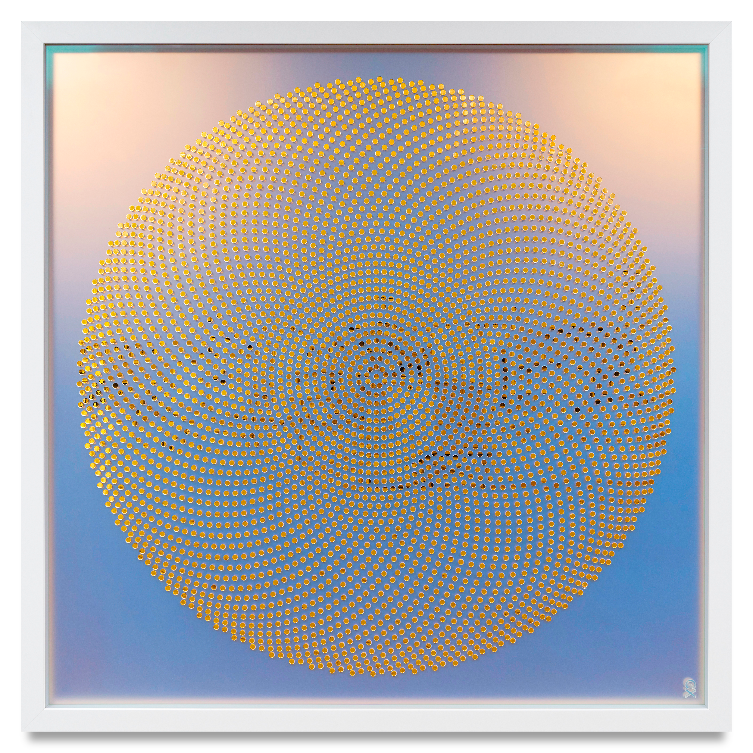 Gold mirror acrylic discs set on iridescent frosted acrylic background