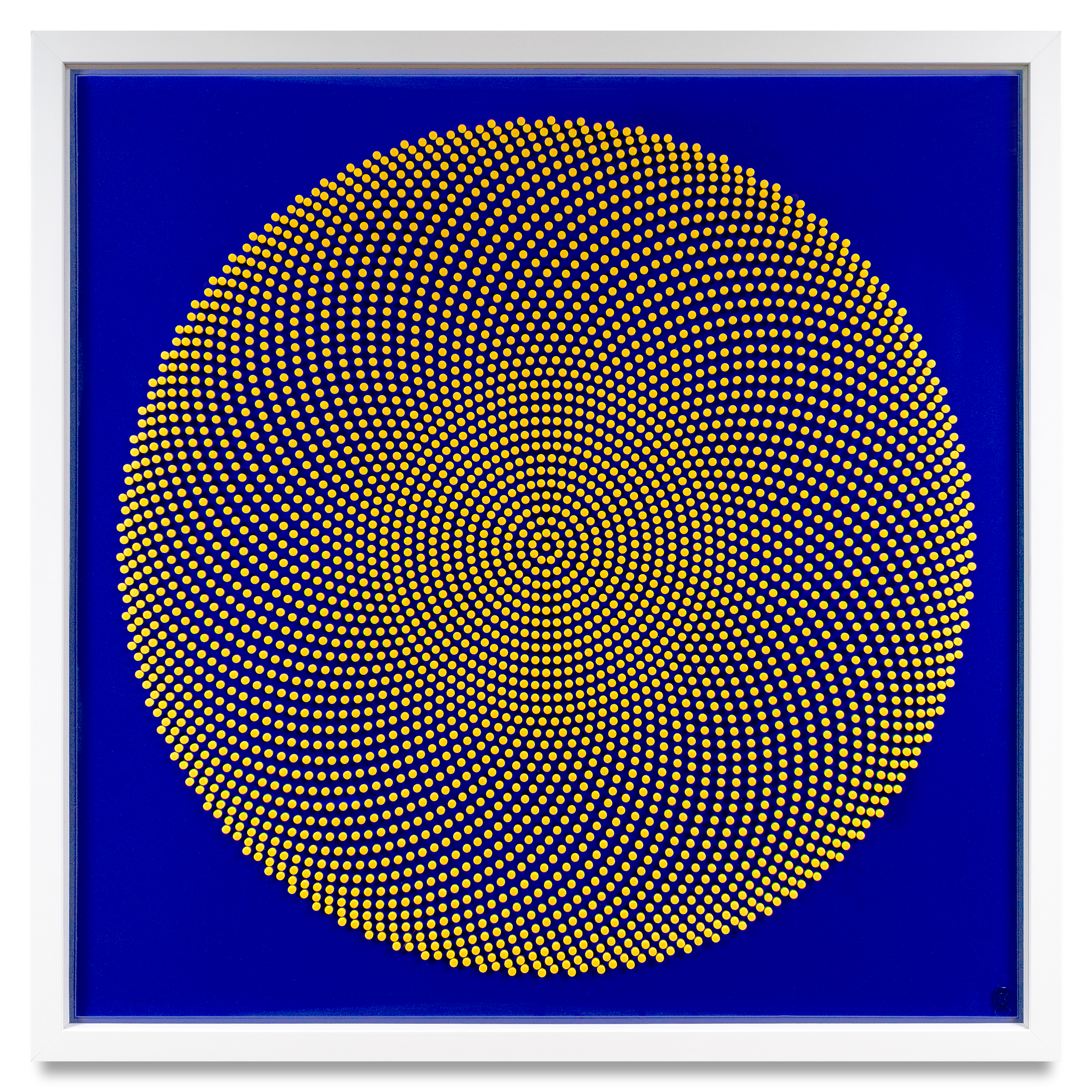 Mustard gloss acrylic discs set on deep blue frosted acrylic background