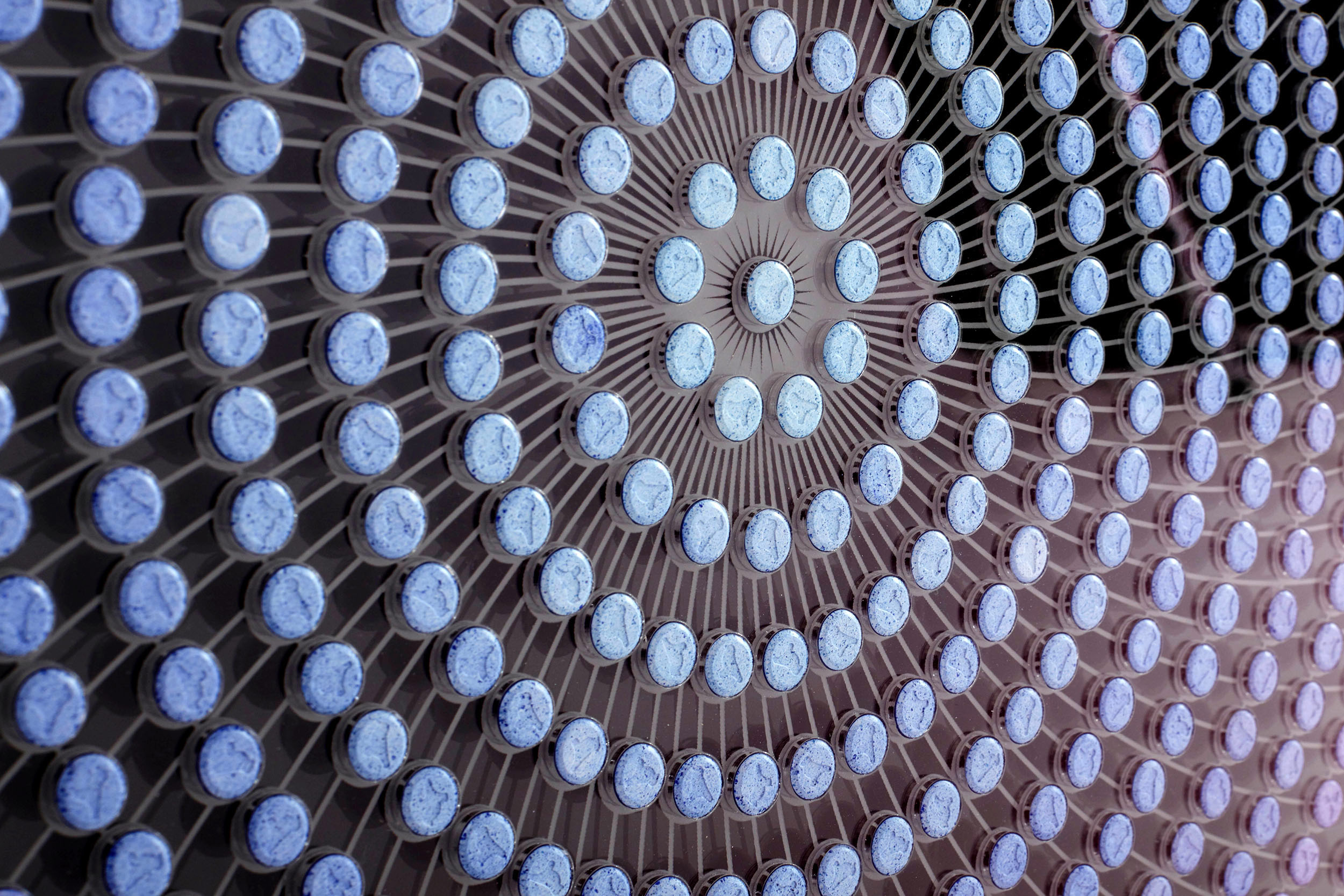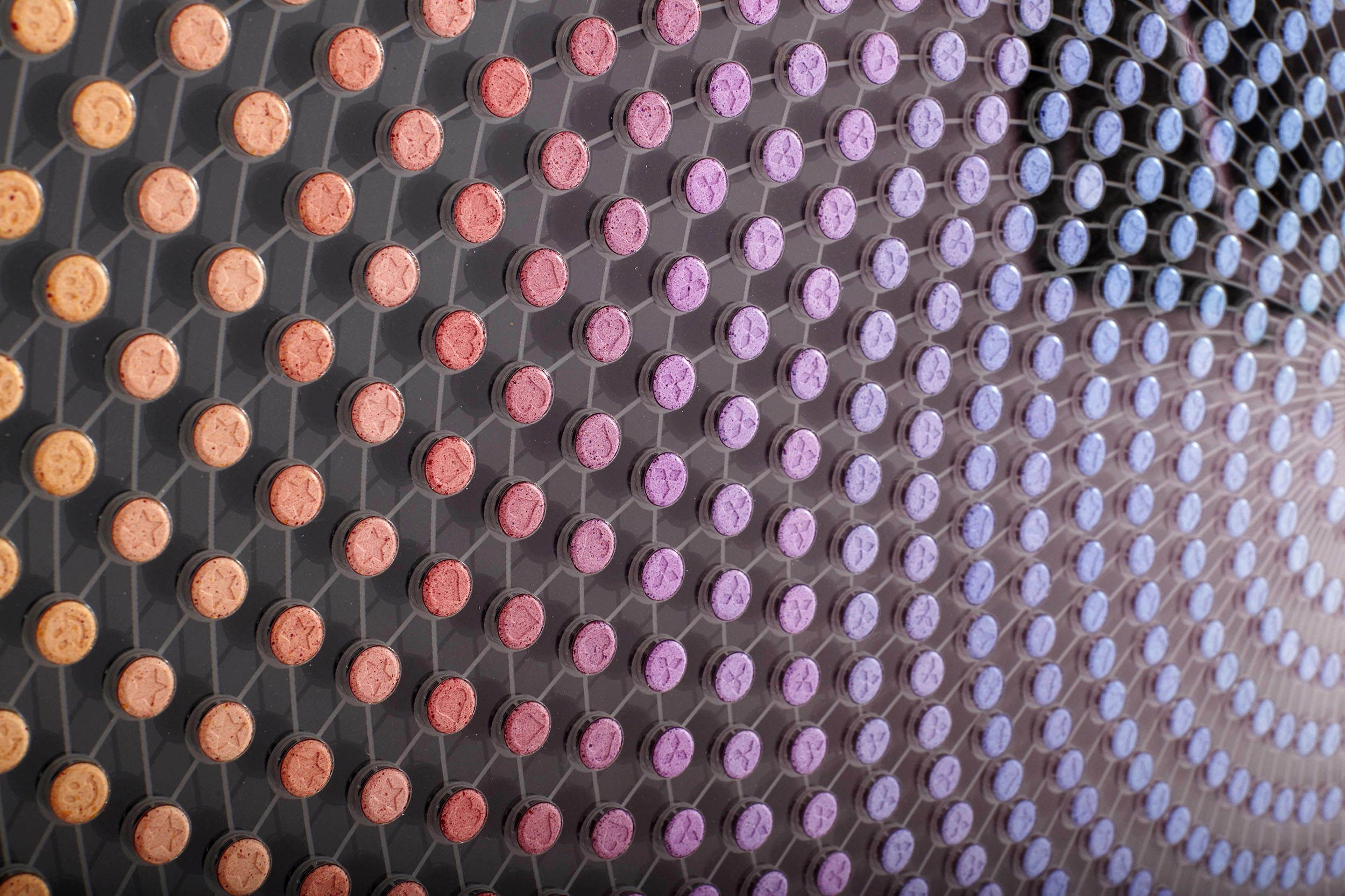 10mm cast acrylic. Laser cut and etched museum grade non-reflective, UV resistant cast acrylic. Glazed in museum grade non-reflective, UV resistant glass. 2589 multi-coloured pills made from microcellulose, magnesium stearate and other materials. Embossed with Mitsubishis, Rolexes, smilies, doves, clubs, stars, Adams, yin yangs, dollars and love hearts.