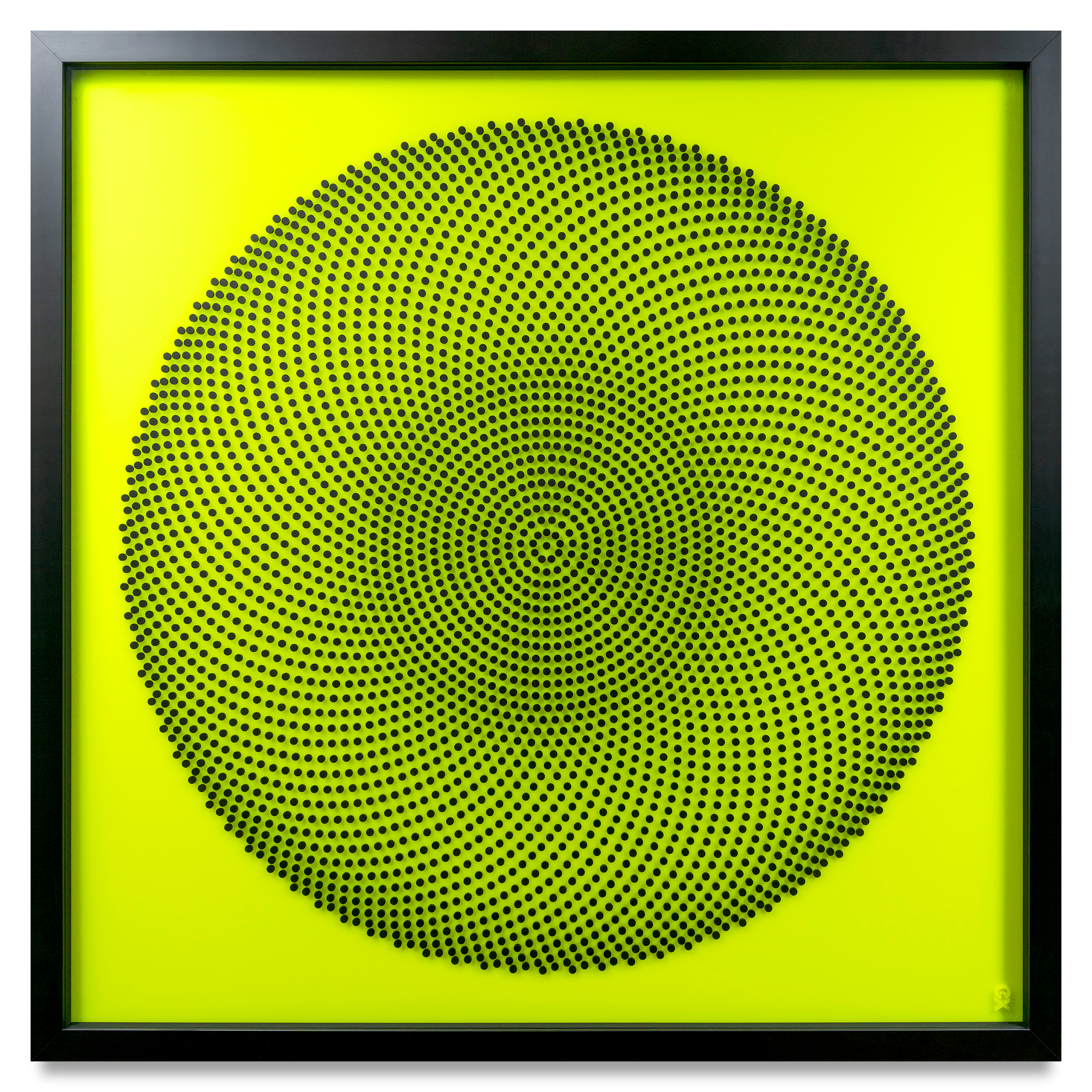 Black frosted acrylic discs set on fluorescent yellow acrylic background