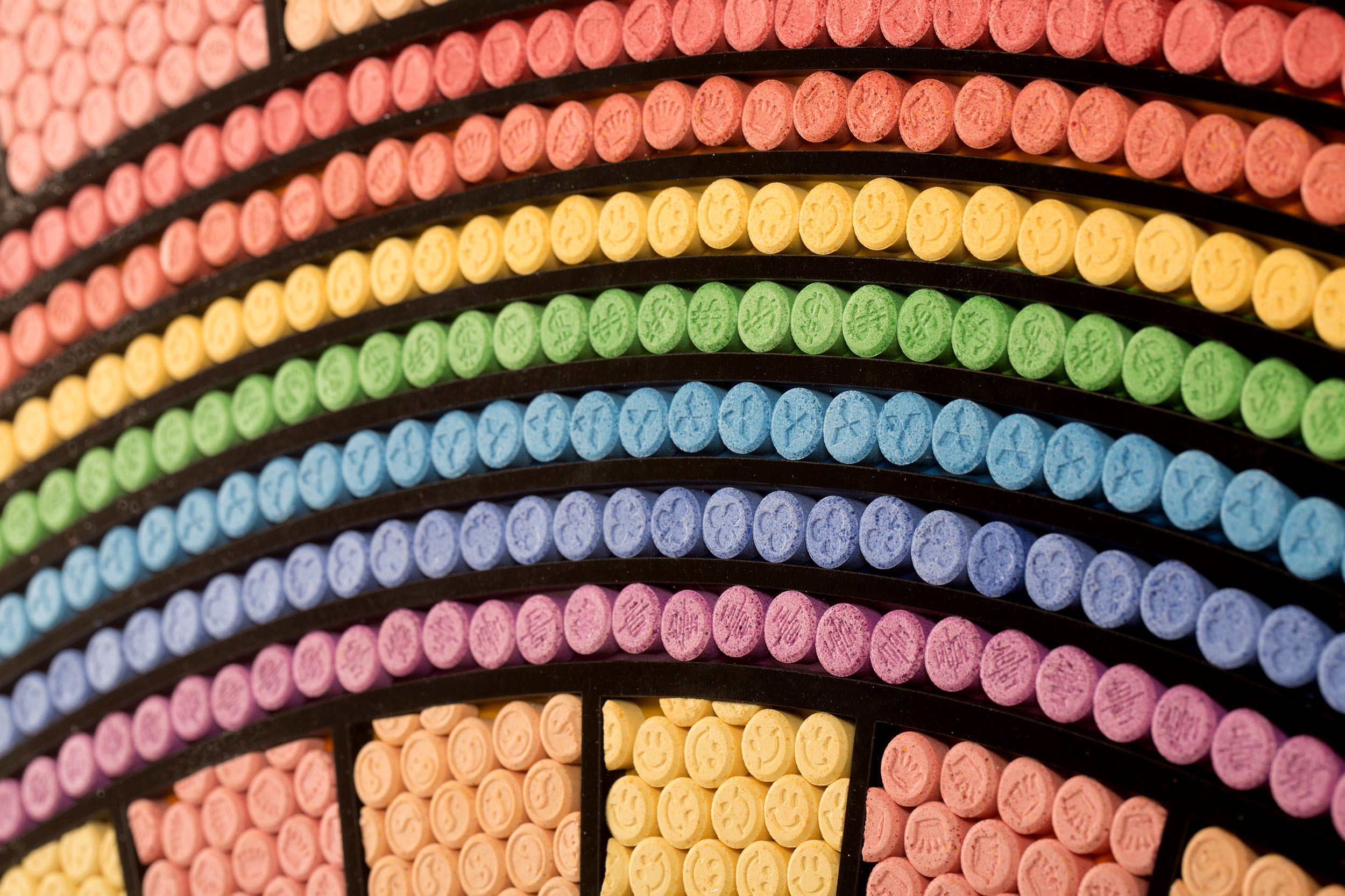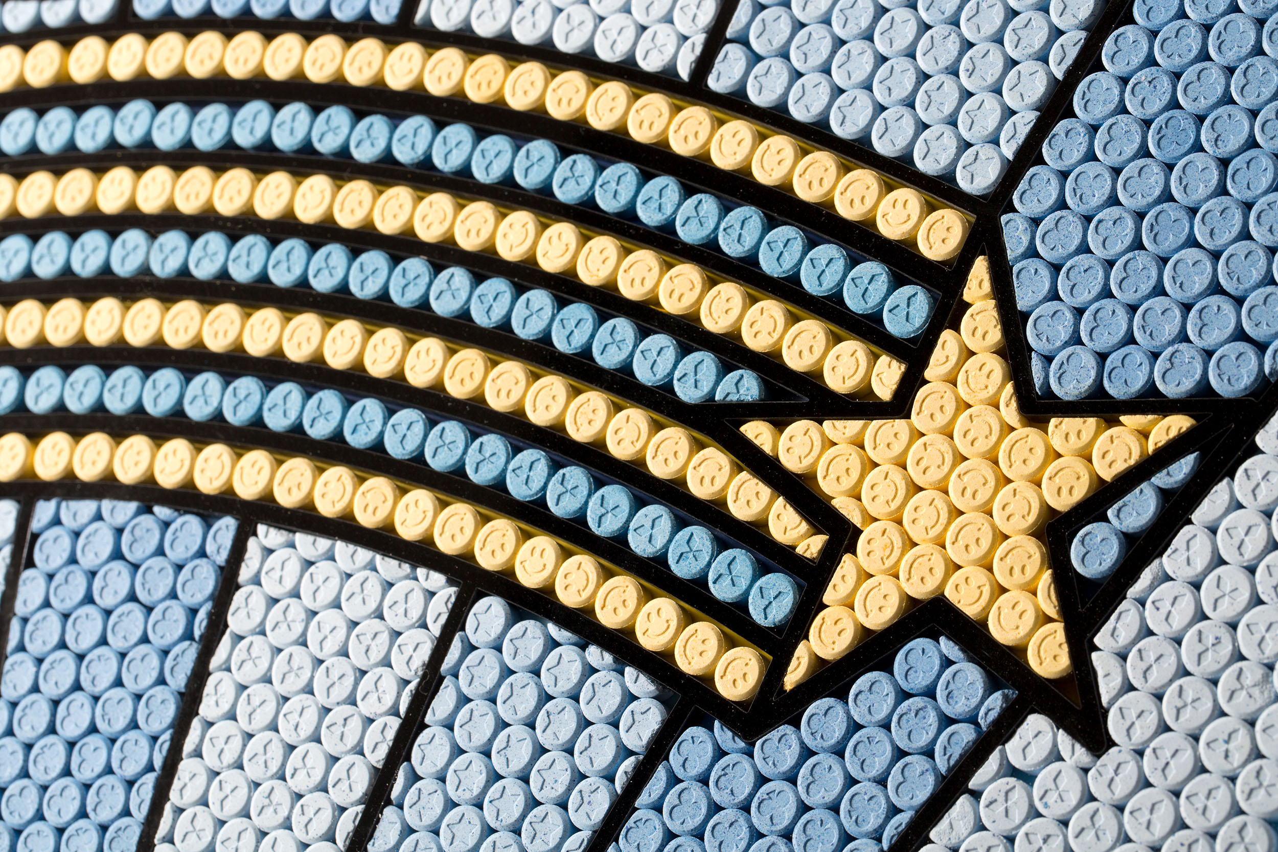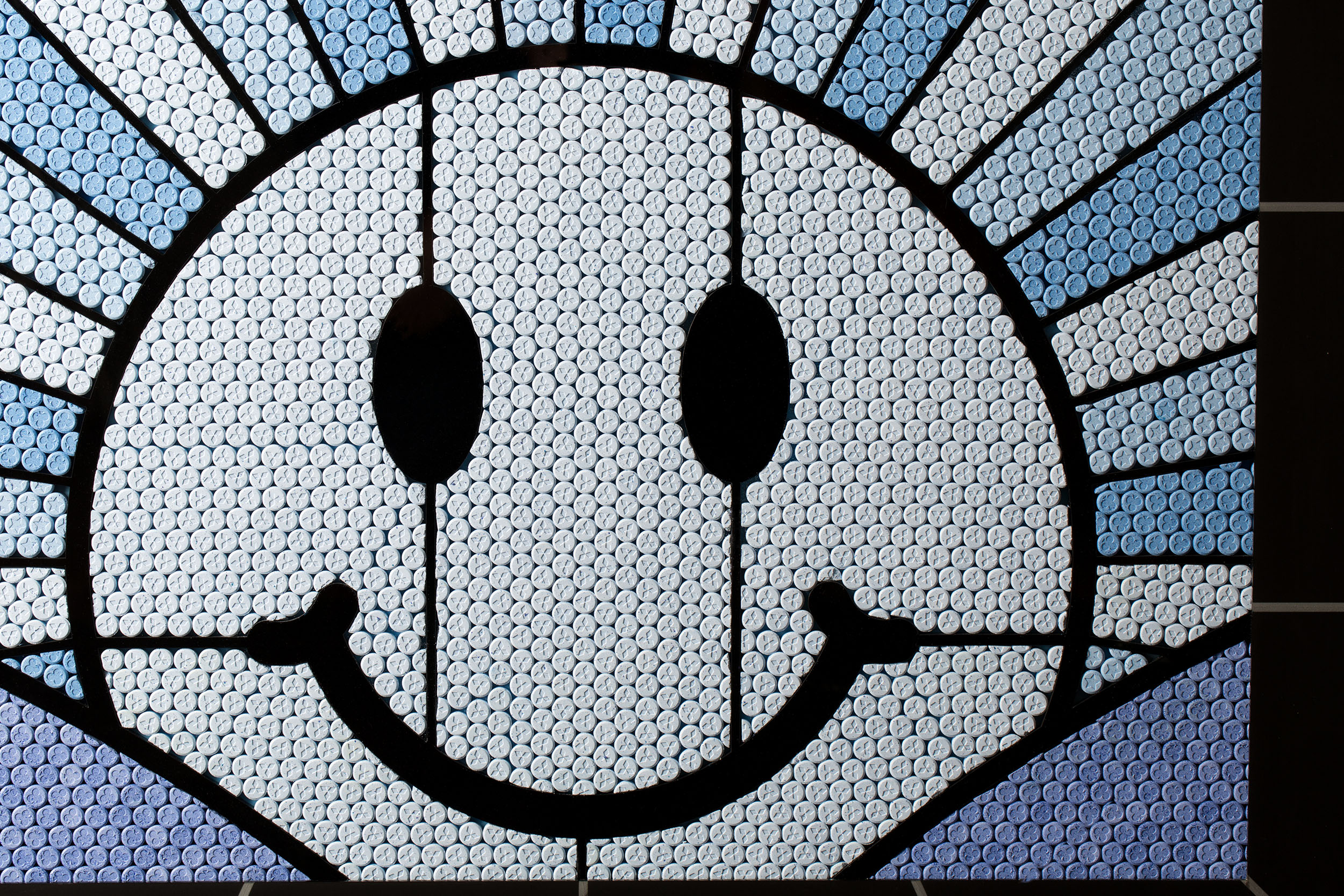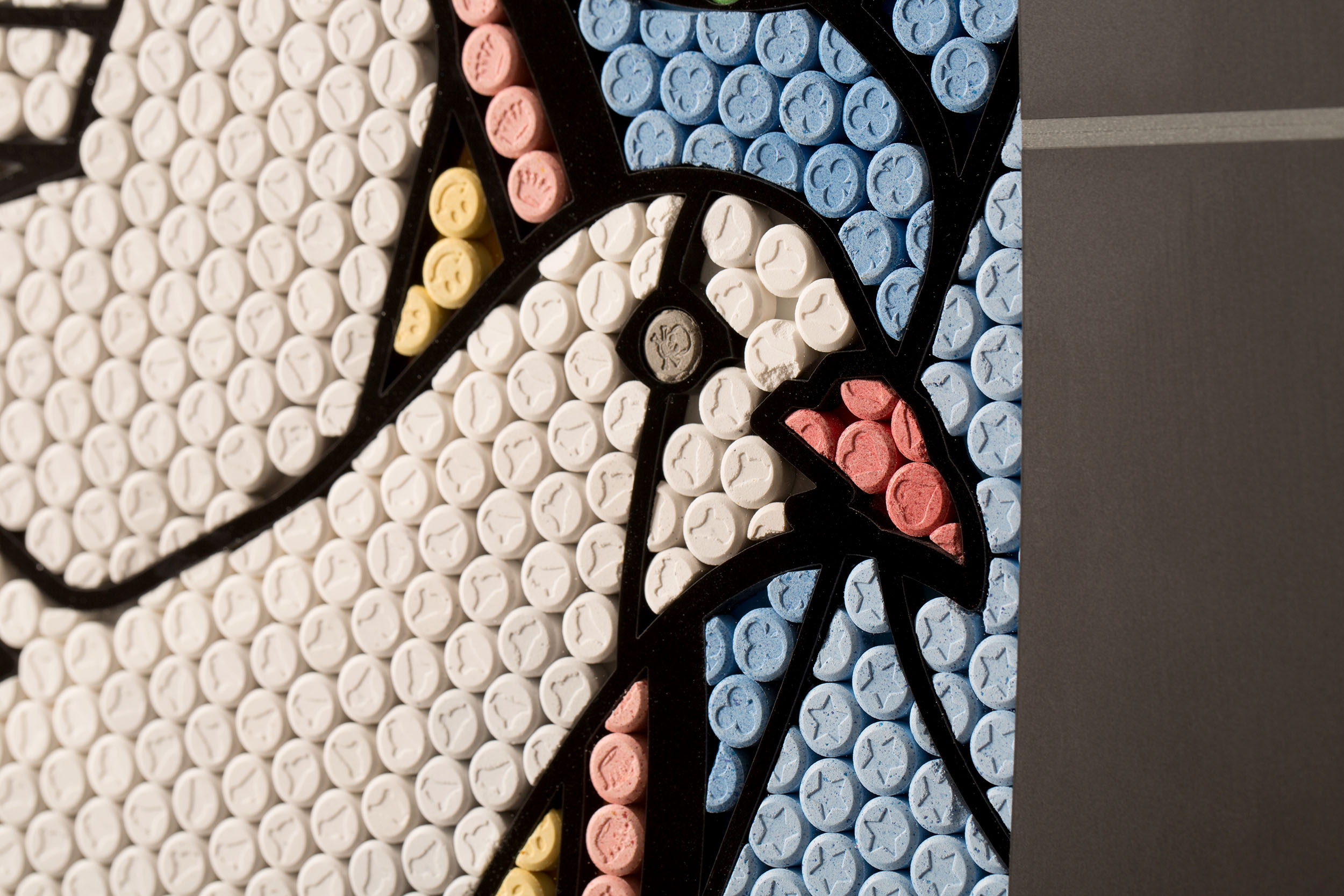 Aluminium composite sheet, laser cut & etched cast acrylic, museum grade non-reflective, UV resistant cast acrylic. Over 10,000 pills, made from microcellulose, magnesium stearate and other materials. Embossed with dollars, smilies, love hearts, Mitsubishis, doves, Rolexes, clubs, yin yangs and stars.
