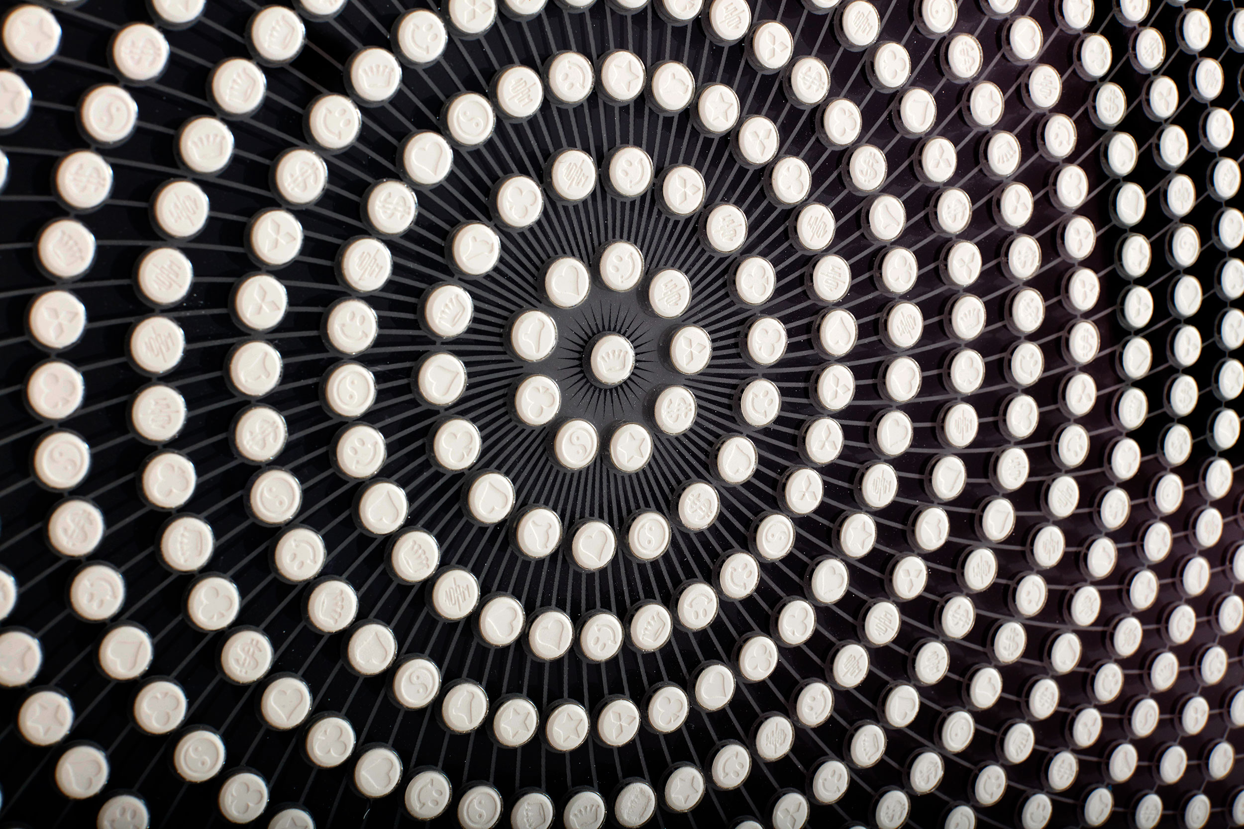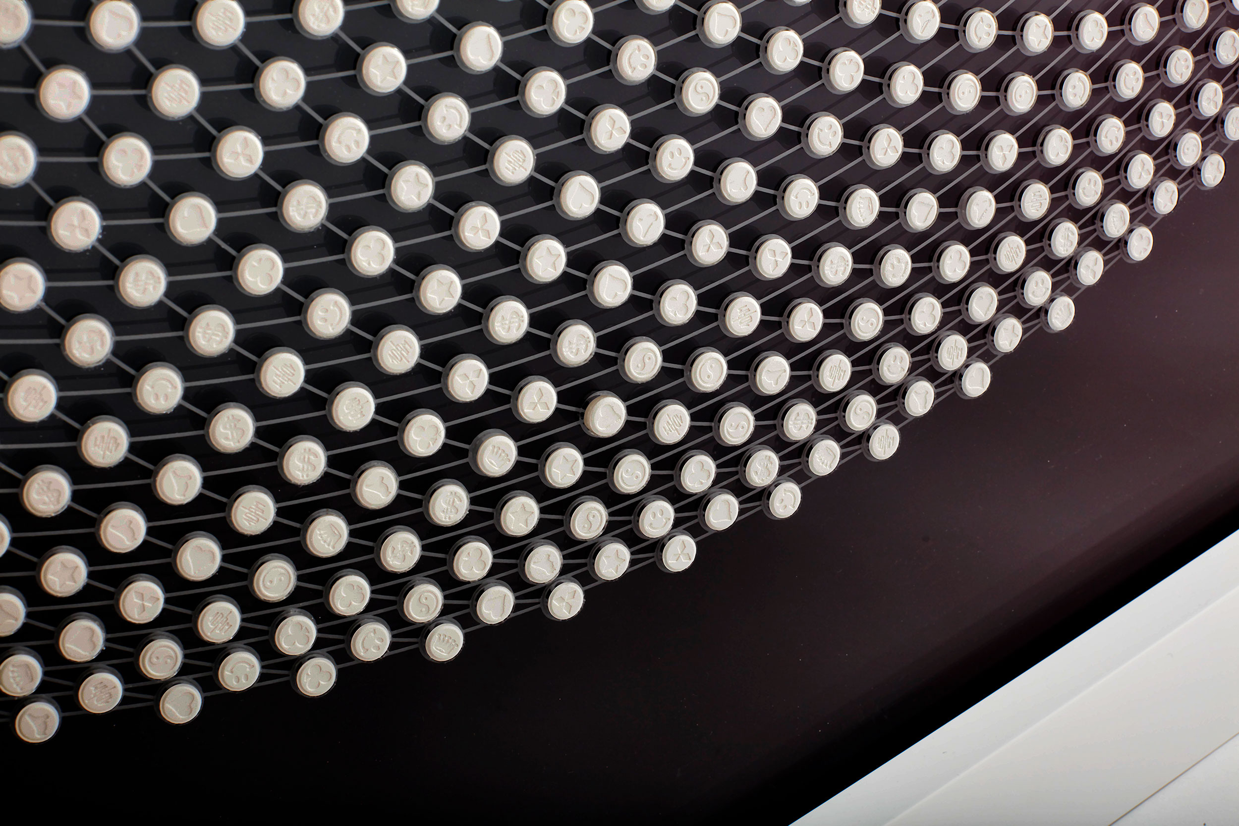 10mm cast acrylic. Laser cut and etched museum grade non-reflective, UV resistant cast acrylic. Glazed in museum grade non-reflective, UV resistant glass. 2589 pure white pills made from microcellulose, magnesium stearate and other materials. Embossed with Mitsubishis, Rolexes, smilies, doves, clubs, stars, Adams, yin yangs, dollars and love hearts.