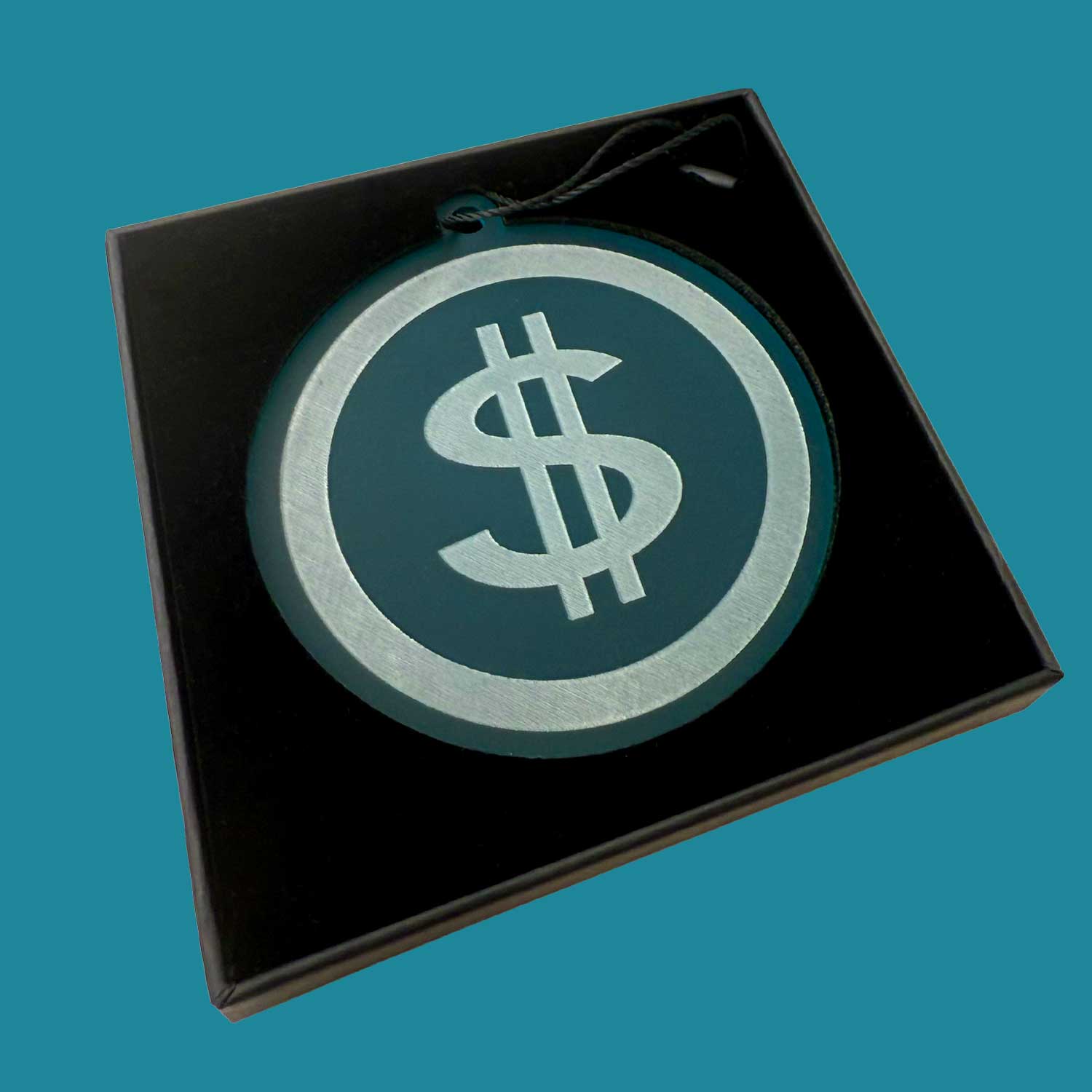 Hand-made blue Dollar decoration in frosted acrylic etched to one side.