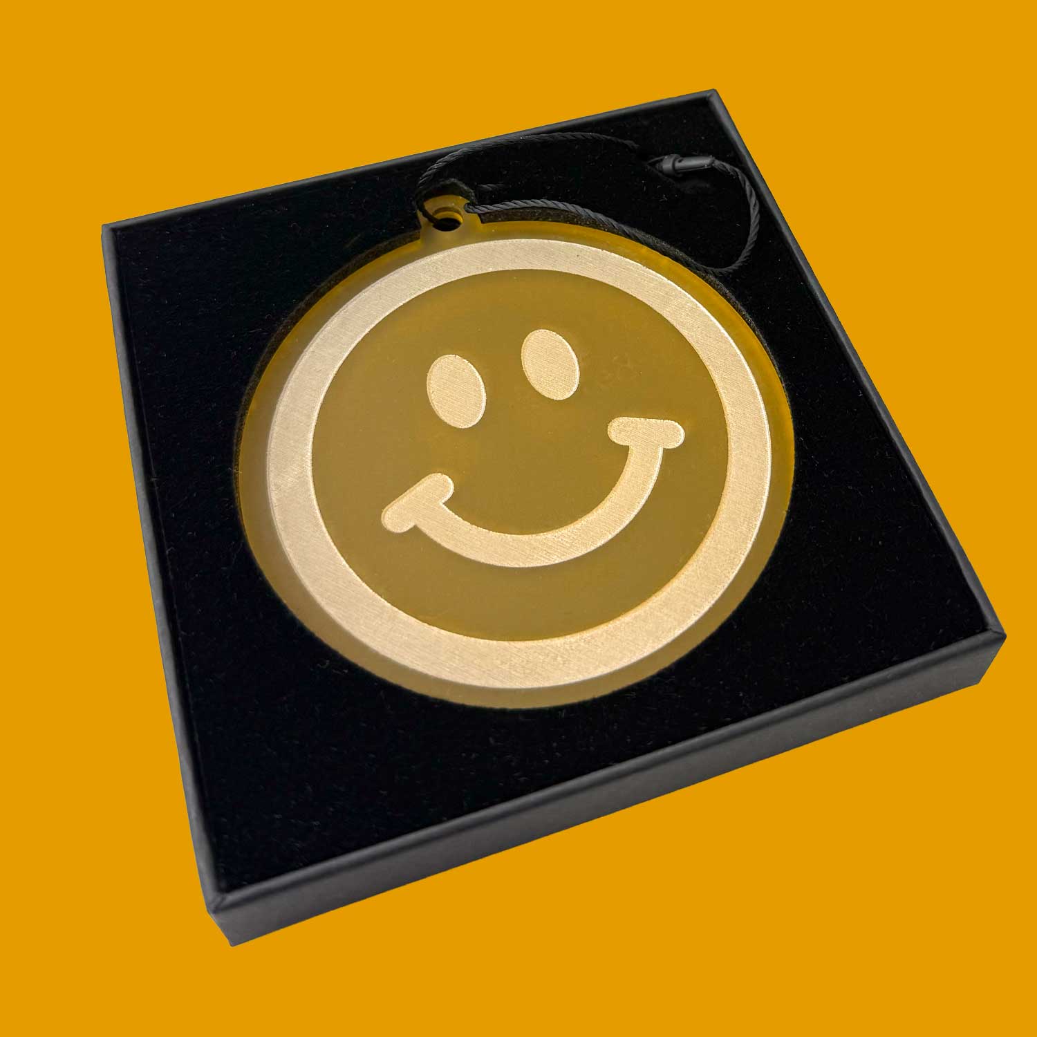 Hand-made yellow Smiley decoration in frosted acrylic etched to one side.