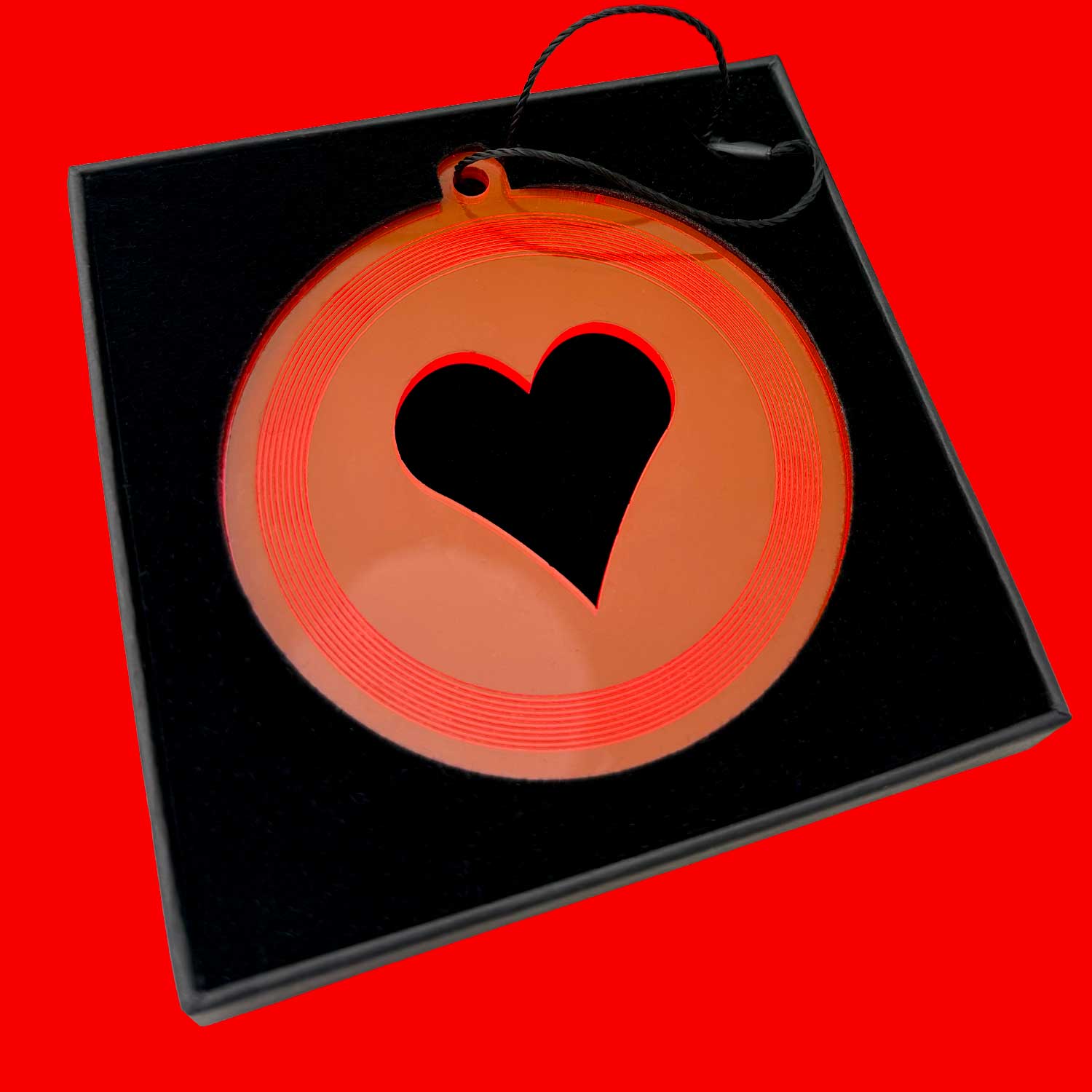 Hand-made Neon red Love Heart decoration in edge lit fluorescent acrylic.